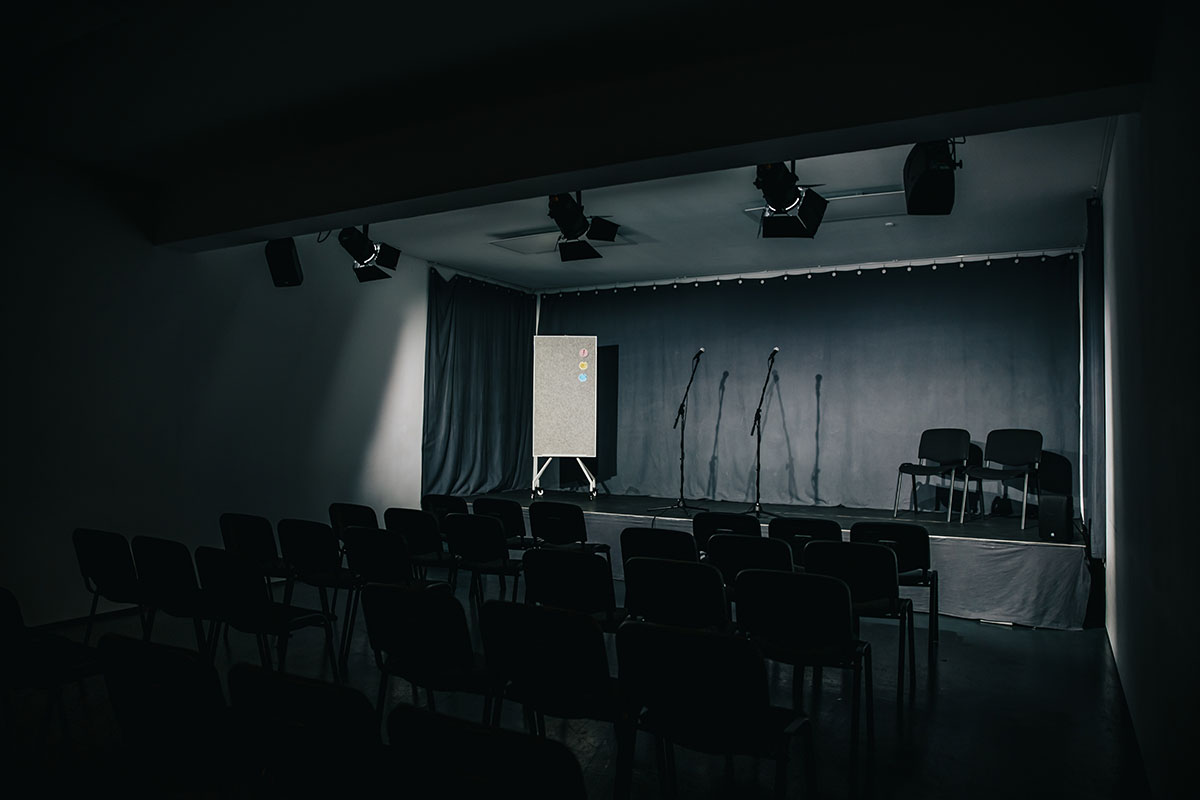Wir bieten eine voll ausgestattete Bühne mit professioneller Licht- und Tontechnik, einen Seminarraum mit Flipcharts und Beamer.