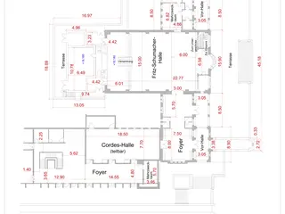 Zwei angrenzende Foyers erweitern die Nutzungsmöglichkeiten und eignen sich hervorragend für Ausstellungen, Check-in-Bereiche, Catering oder informelle Begegnungen. Ein zusätzlicher Raum kann als Referentenbereich, Tagungsbüro, Presseraum oder Künstlergarderobe genutzt werden. Die Nähe zur Fritz-Schumacher-Halle ermöglicht eine besonders reibungslose Kombination beider Räume.