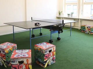 Die entsprechende Technik und wichtigsten Tools sind natürlich vorhanden. Auch finden Sie bei uns genügend Material für den Prototyping-Bau. Brauchen Sie Abwechslung in den Pausen? Kein Problem: Tischtennisplatte und Dartscheibe sind auch vorhanden! Festgefahrenen Denkmustern oder Meetings wird somit gekonnt entgegengewirkt! Der Raum ist ansprechend und praktikabel möbliert, gerne nehmen wir die Möbel aber auch für Sie raus. Sagen Sie uns einfach Bescheid, wie der Raum gebraucht wird.