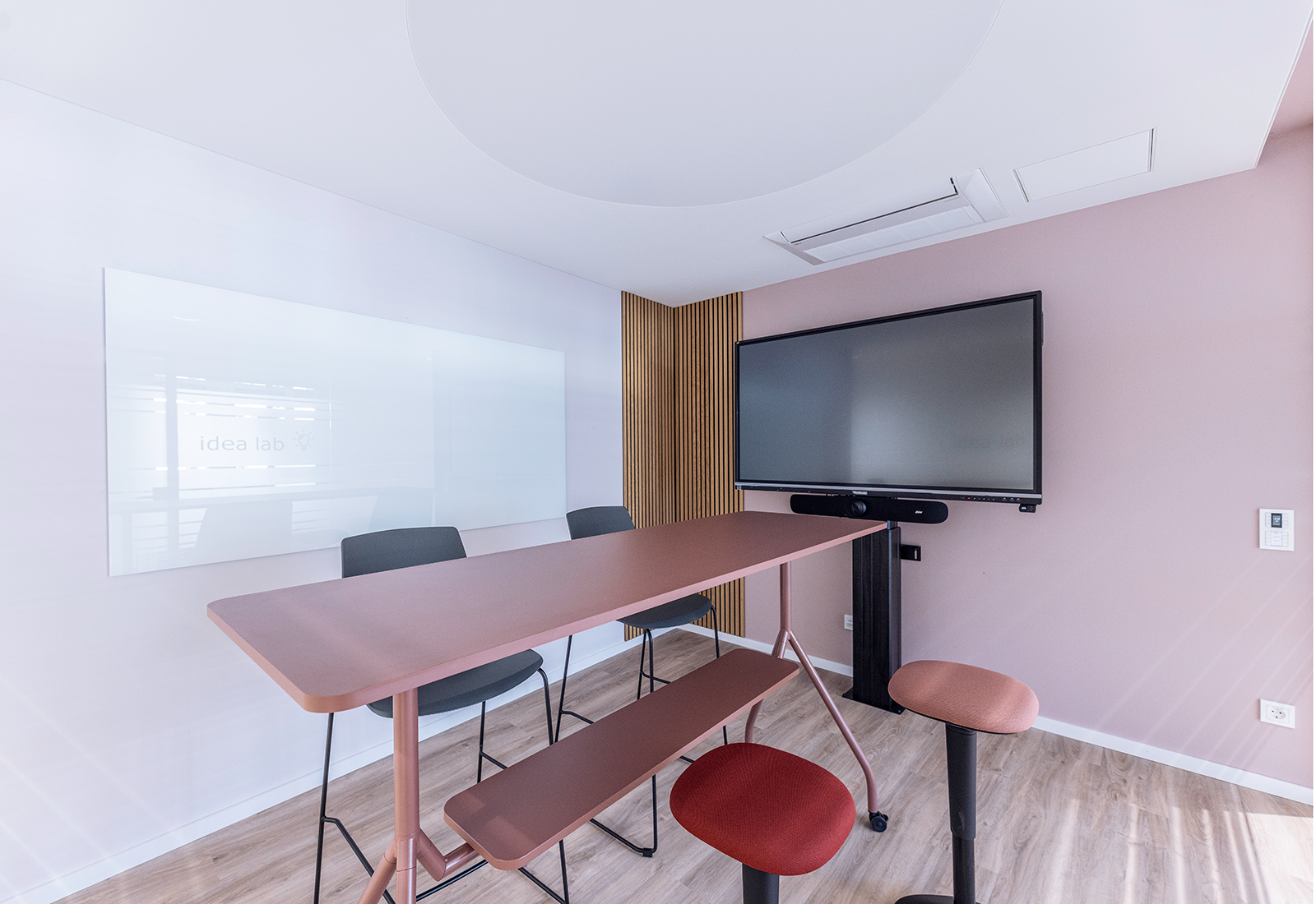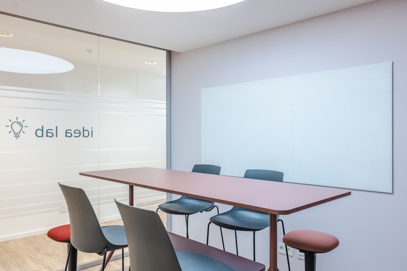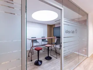Das Idea Lab ist unser Kreativraum für alle, die anders denken und neue Wege gehen wollen. Mit flexiblen Möbelmodulen, beschreibbaren Wänden, inspirierenden Farbakzenten und jeder Menge Raum für Gedanken ist dieser Raum wie gemacht für Design Sprints, Innovationsworkshops und kreative Meetings. Hier darf gedacht, gesponnen und erschaffen werden – Idea Lab ist der Ort, an dem Ideen zum Leben erwachen.