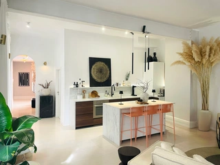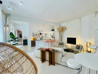 - Großer Raum mit offener Küche und Theke