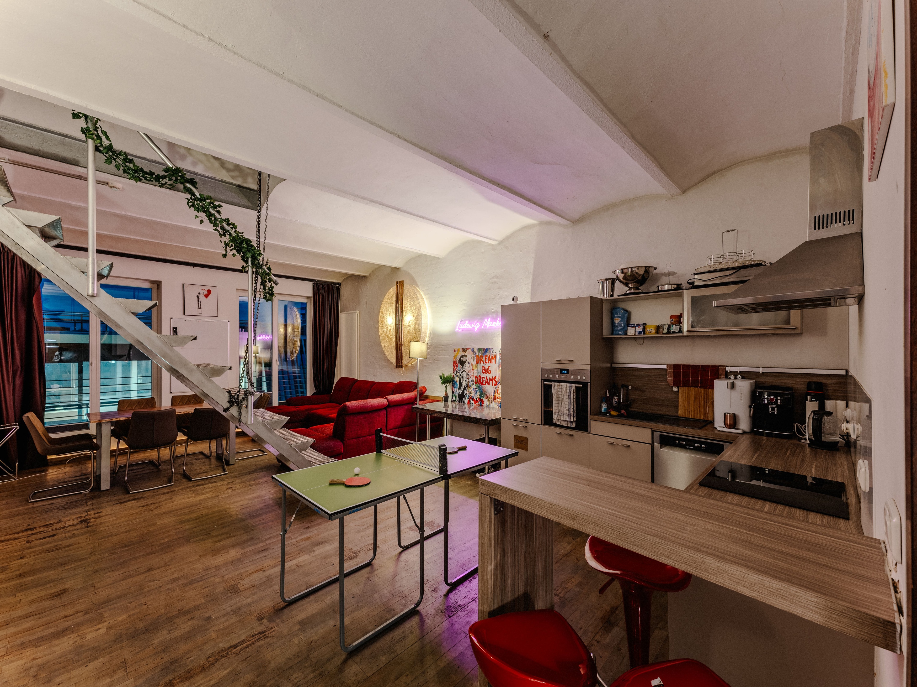 Doch mit diesem gemütlich eingerichteten Wohnzimmer mit Loft-Charakter und angrenzender Dachterrasse hast du deine Traumlocation gefunden! In Berlin Pankow kannst du hier auf 160 qm mit bis zu 40 Personen feiern und tanzen, den Abend mit dem Sonnenuntergang über den Dächern Berlins genießen oder einfach in einer kleineren Gruppe zusammen kochen oder einen Spieleabend veranstalten.