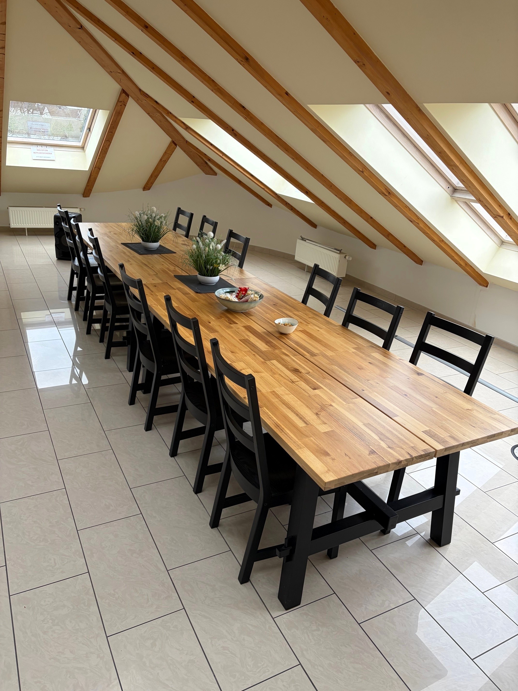 Gleichzeitig bietet die Location genügend Raum, um zwischendurch abzuschalten. Ein Billardtisch, Sofa-Bereich und die ruhige Atmosphäre im Haus sorgen für entspannte Pausen. Dachschrägen, große Fensterflächen und viel Tageslicht schaffen eine helle Umgebung, in der konzentriertes Arbeiten leichtfällt.
