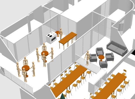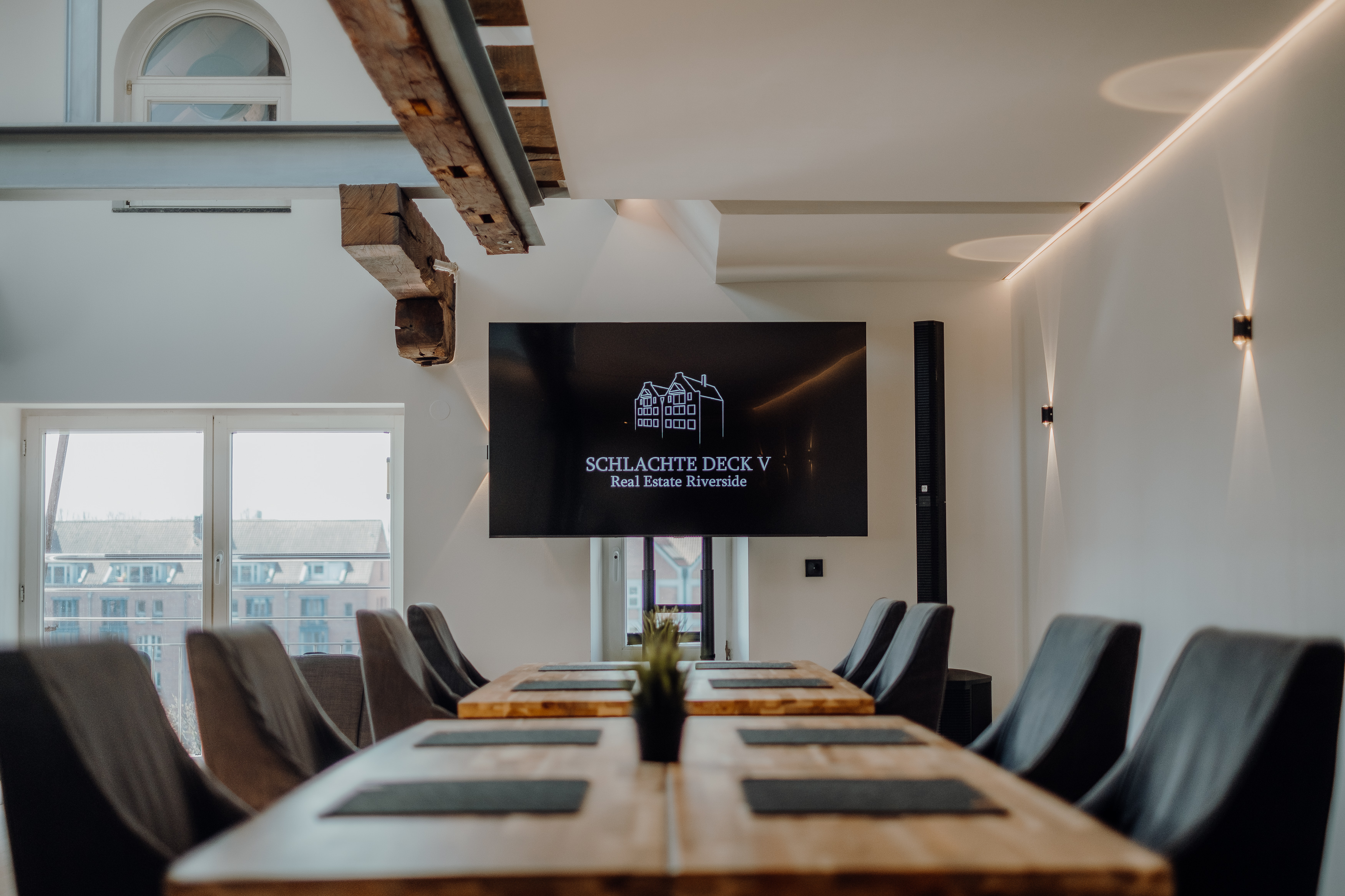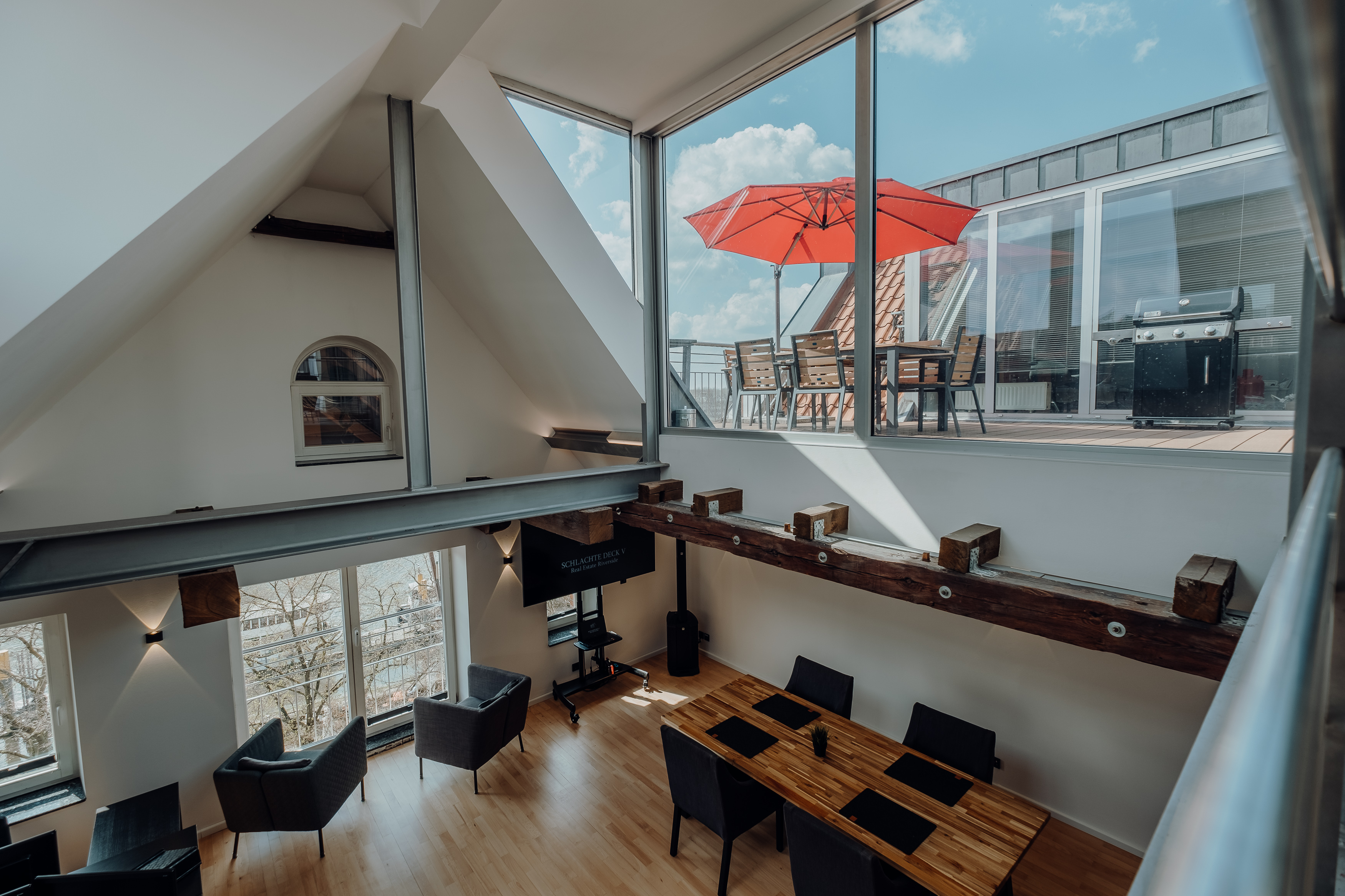 Genau wie das Deck5 - es ist in verschiedene Bereiche eingeteilt, aber schafft durch die offene Gestaltung eine Verbindung. Hier werden auf der linken Seite aus zwei kleinen Konferenztischen ein großer, es gibt gemütliche Sitzgelegenheiten für alle und einen TV-Flatscreen für erfolgreiche Präsentationen. Während auf der rechten Seite insgesamt 5 PC-Arbeitsplätze (mit jeweils 2 Monitoren) stehen, an denen konzentriert gearbeitet werden kann. Die Loungeecke im oberen Bereich eignet sich perfekt für Breakouts bzw. kleine Gruppenarbeiten. Und bei gutem Wetter lässt sich das Meeting sogar nach draußen auf die Dachterrasse verlegen - unter dem großen Sonnenschirm findet ihr Schutz und könnt das gute Wetter genießen, während ihr bei einer kurzen Gedankenpause in die Ferne schweift.