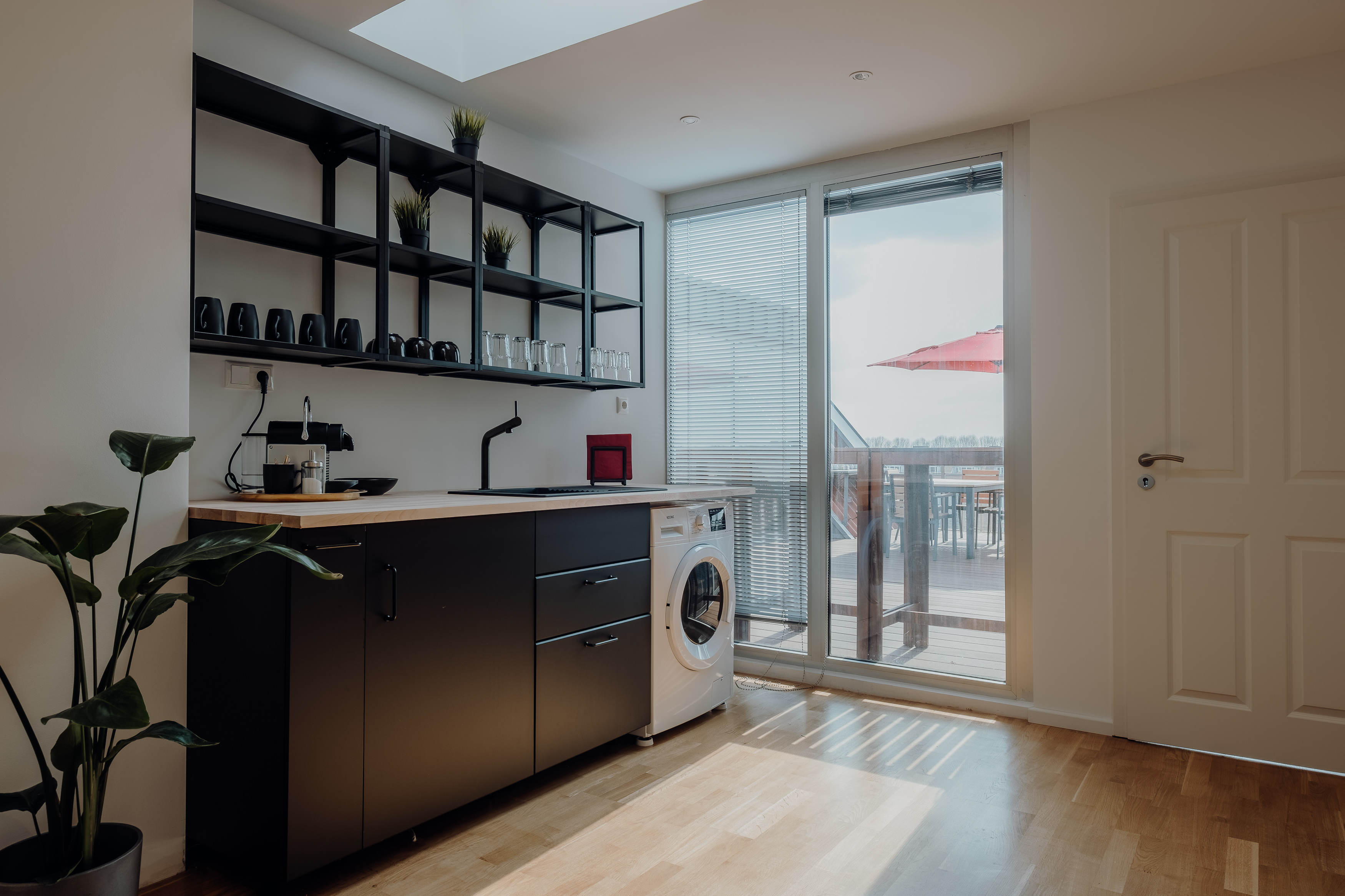 In der kleinen Teeküche könnt ihr euch jederzeit mit Kaffee, Tee oder kühlen Getränken versorgen. Die große Küche eignet sich sogar für Kochevents im Team - der große Tresen lädt ein, sich zusammenzusetzen und beim Kochen zu unterhalten. Das Deck5 verfügt zudem über zwei Toiletten (auf Anfrage sogar 3 WCs) und ein Vollbad inklusive Sauna.