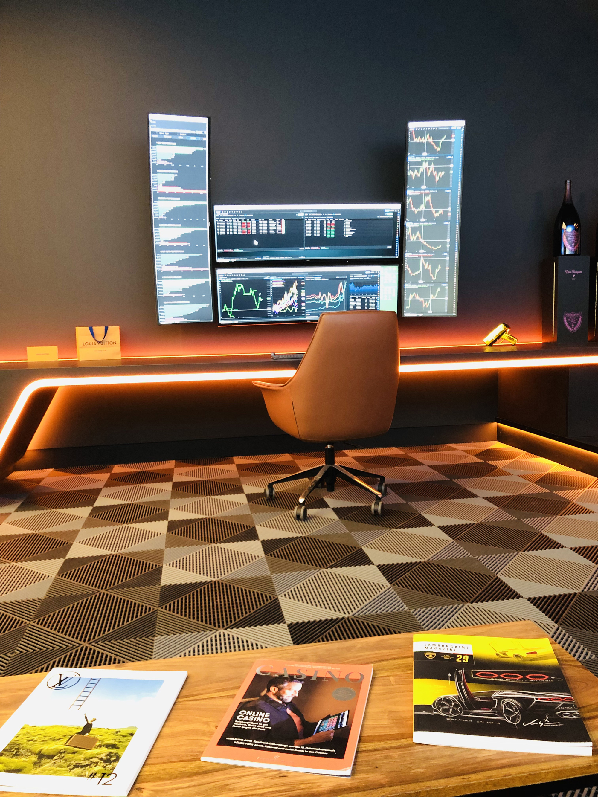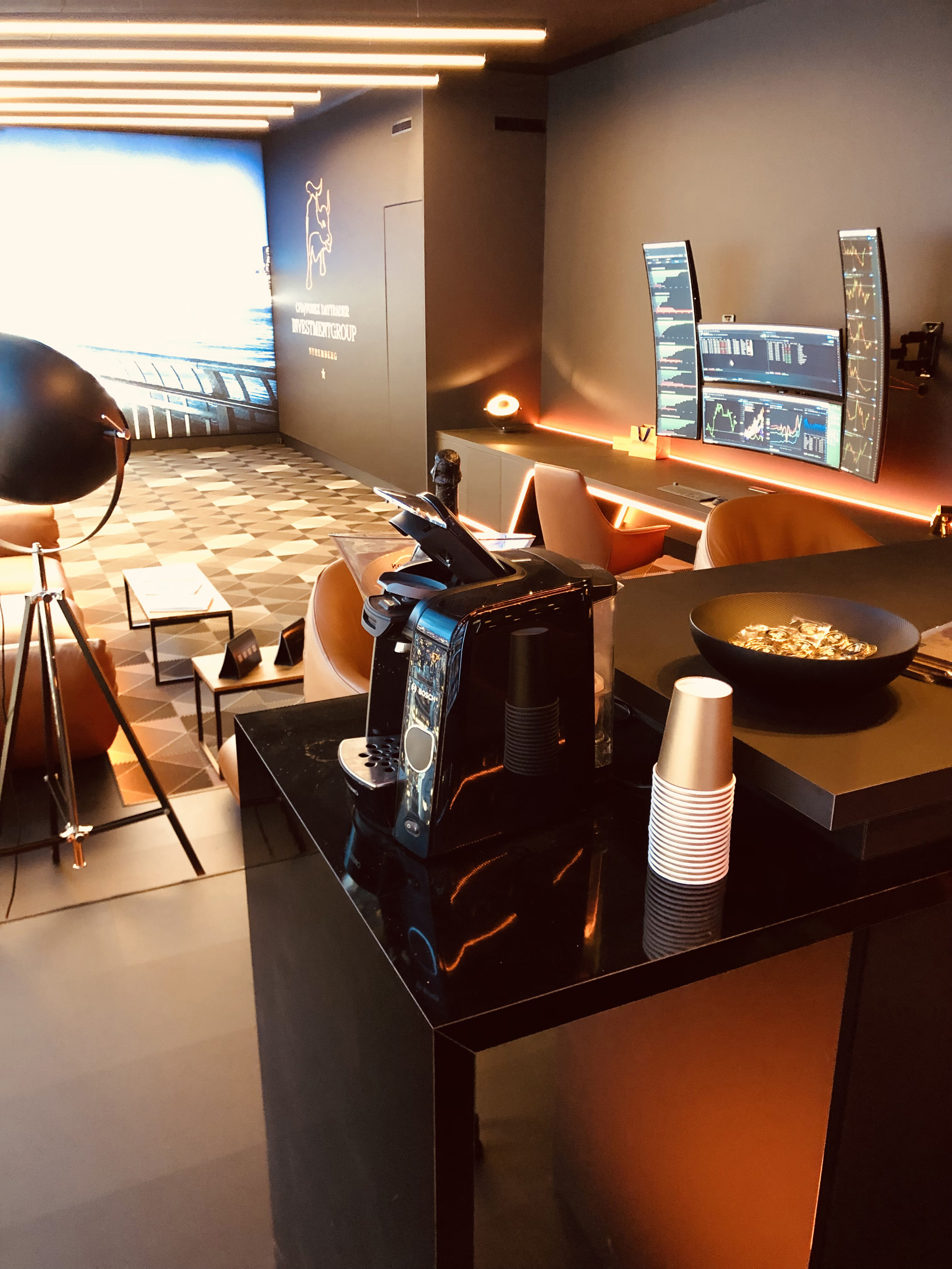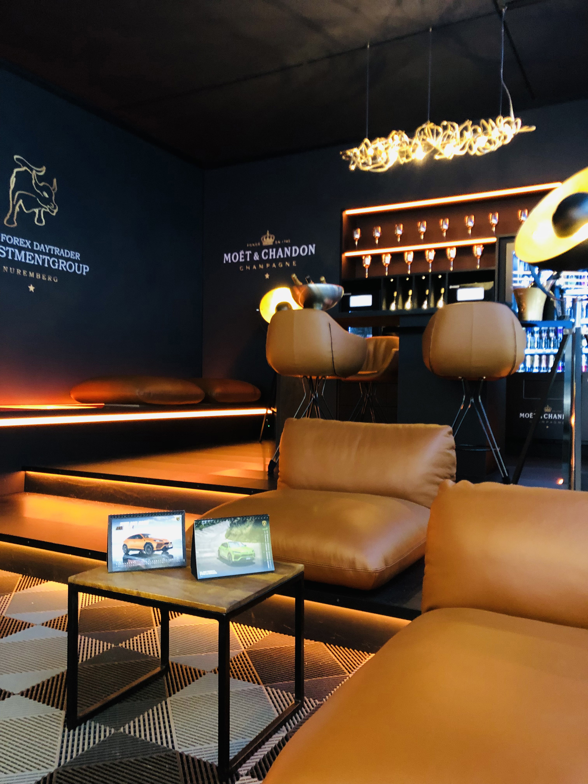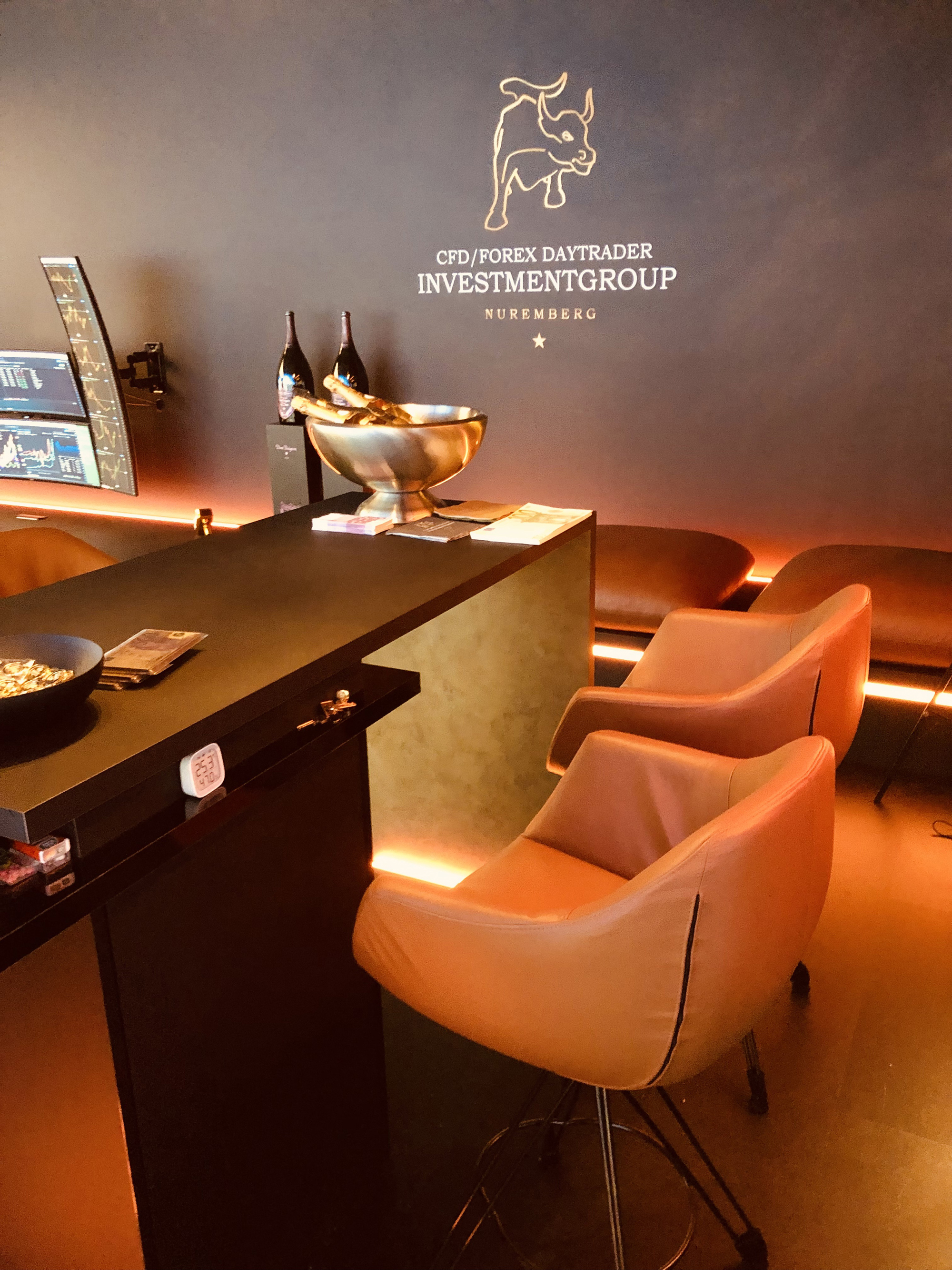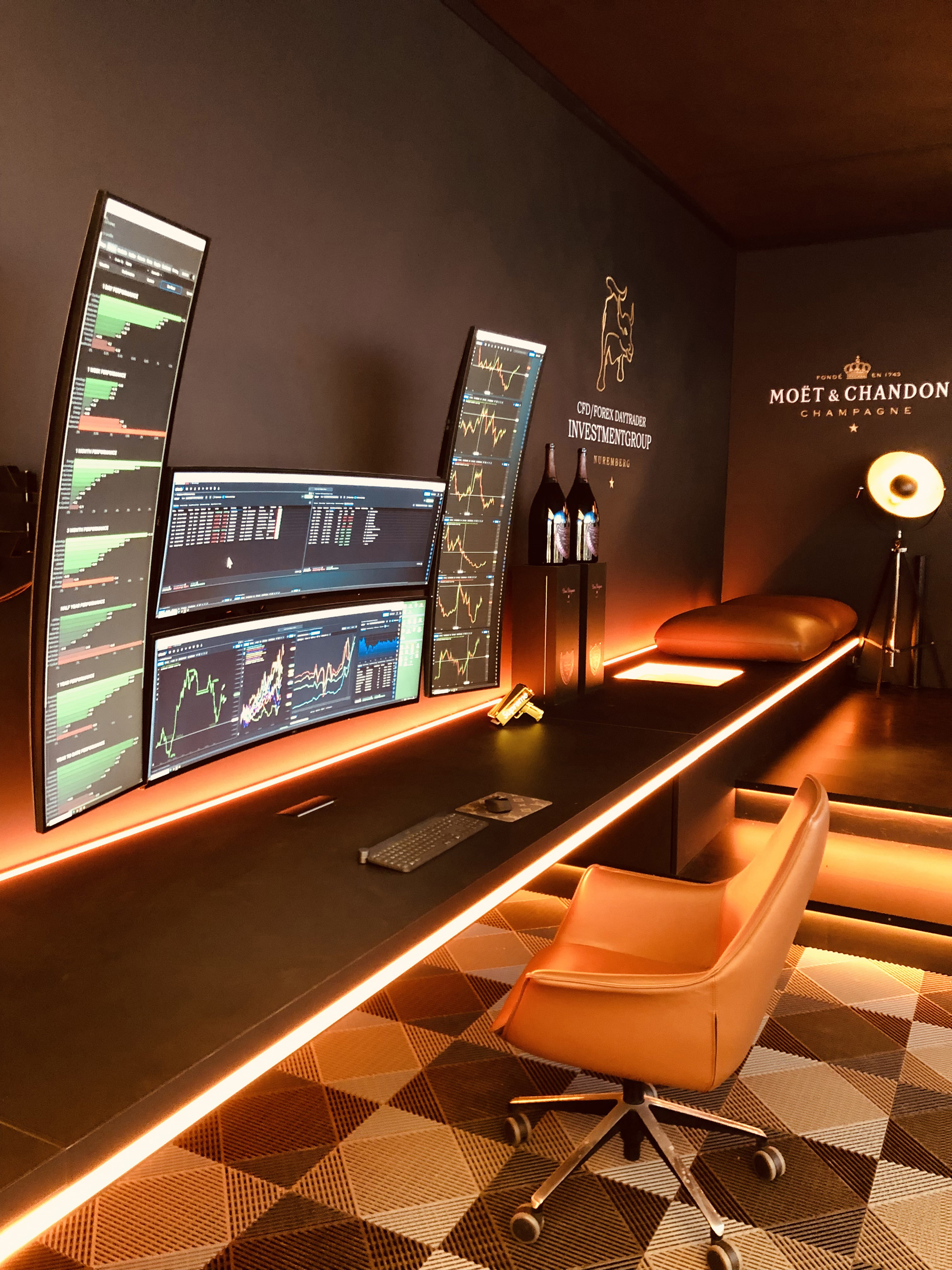 Entspannte Meetings, Besprechungen, Streamings, Podcasts, Film- und TV-Aufnahmen im exklusiven, hochwertig modernen, edlen und deutschlandweit einmaligen Tradingroom.