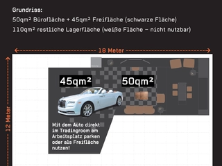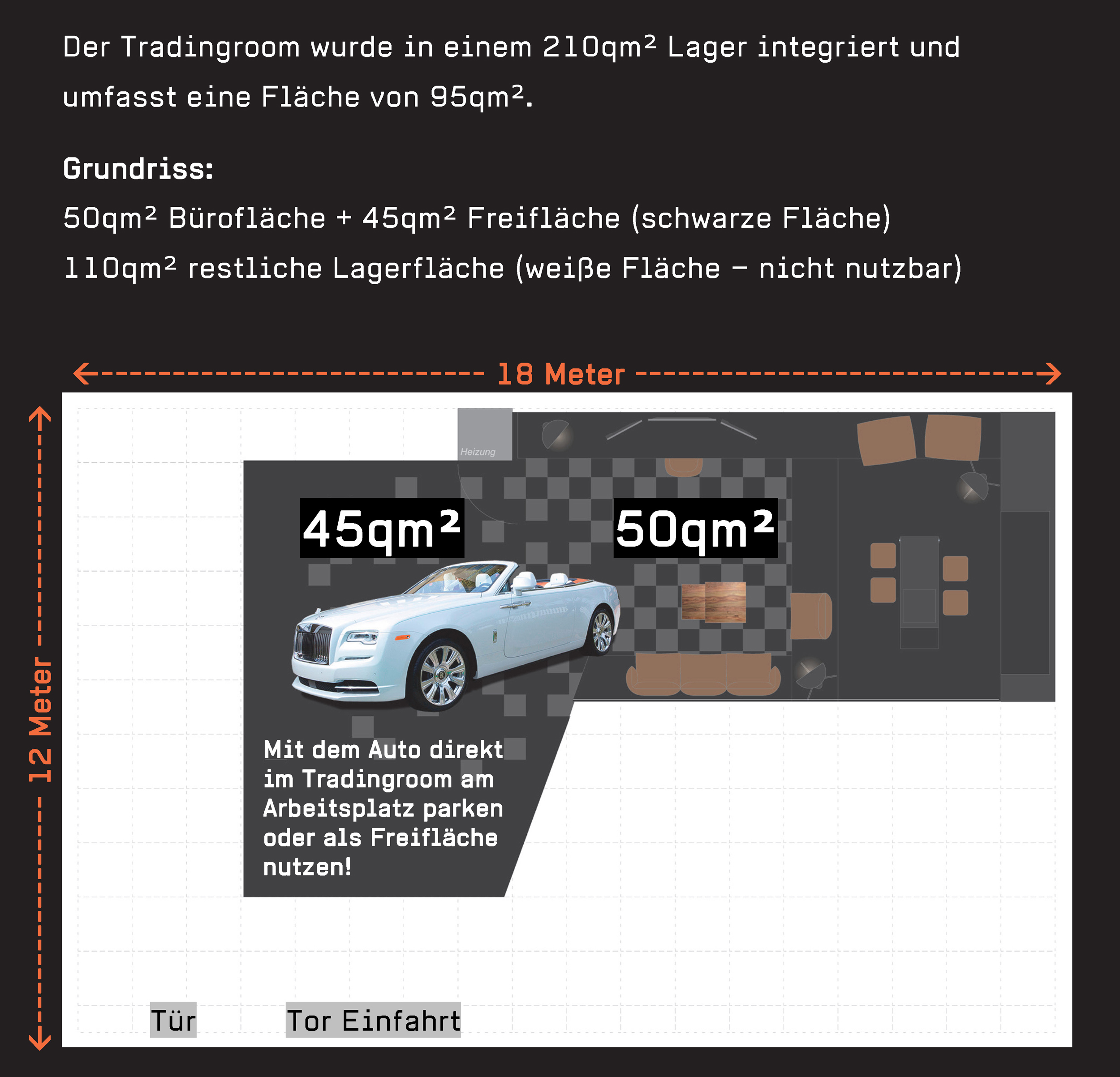 - Der Tradingroom wurde in einem 210qm² Lager integriert und umfasst eine Fläche von 95qm². Grundriss: 50qm² Bürofläche + 45qm² Freifläche (nutzbar - Tradingroom) 110qm² restliche Lagerfläche (nicht nutzbar