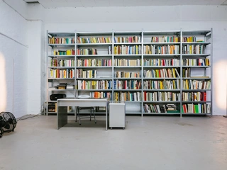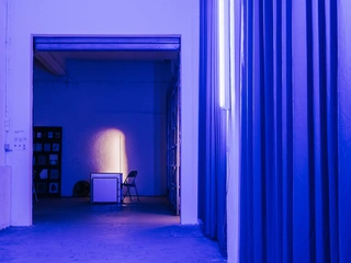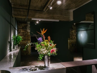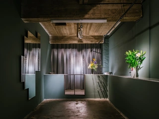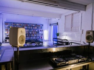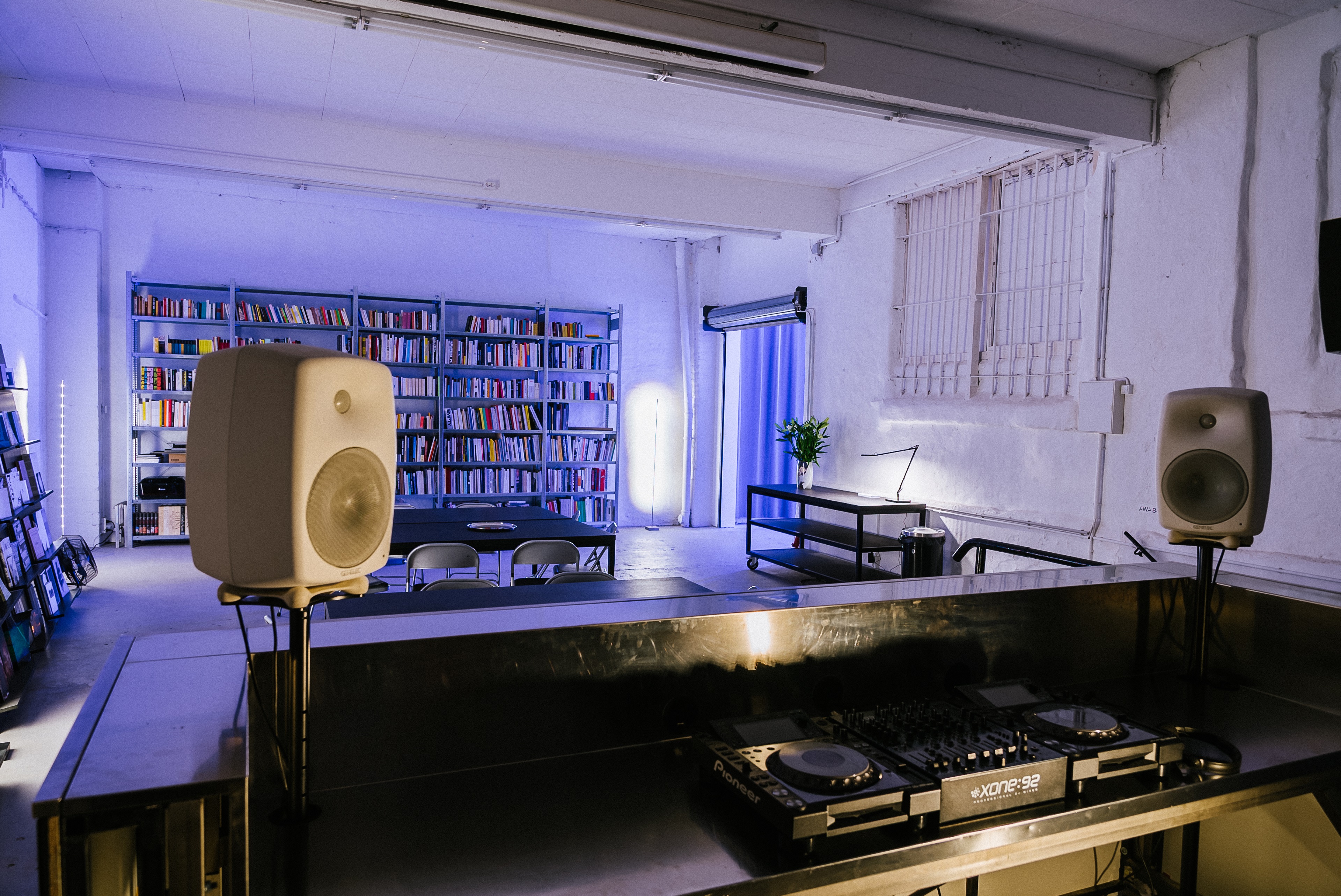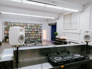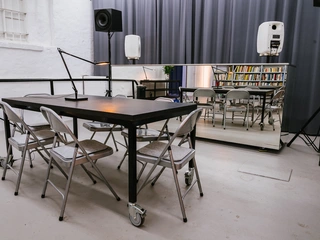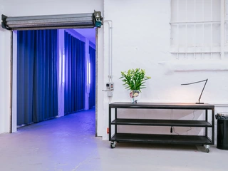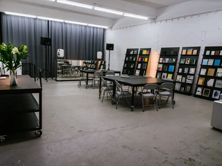 Die wandelbare Fläche des Studios besticht durch ihre zurückhaltende Schwarz-Weiß-Gestaltung und kann individuell auf diverse Eventtypen angepasst werden. Gelegen in einem ruhigen Hinterhof, bietet das Studio eine ungestörte Atmosphäre, die durch die besondere Einrichtung und Gestaltung noch unterstrichen wird. Modern und industriell mit Marmorelementen, hohen Vorhängen, Betonboden und einer drei Meter langen Theke gestaltet, entsteht ein inklusiver und barrierefreier Raum für Besucher. Die Möglichkeit, den Raum durch ein Rolltor zu teilen, ermöglicht es, in kleineren separaten Gruppen zu arbeiten und eine entspannte urbane Tagungs- und Networkingatmosphäre zu schaffen.