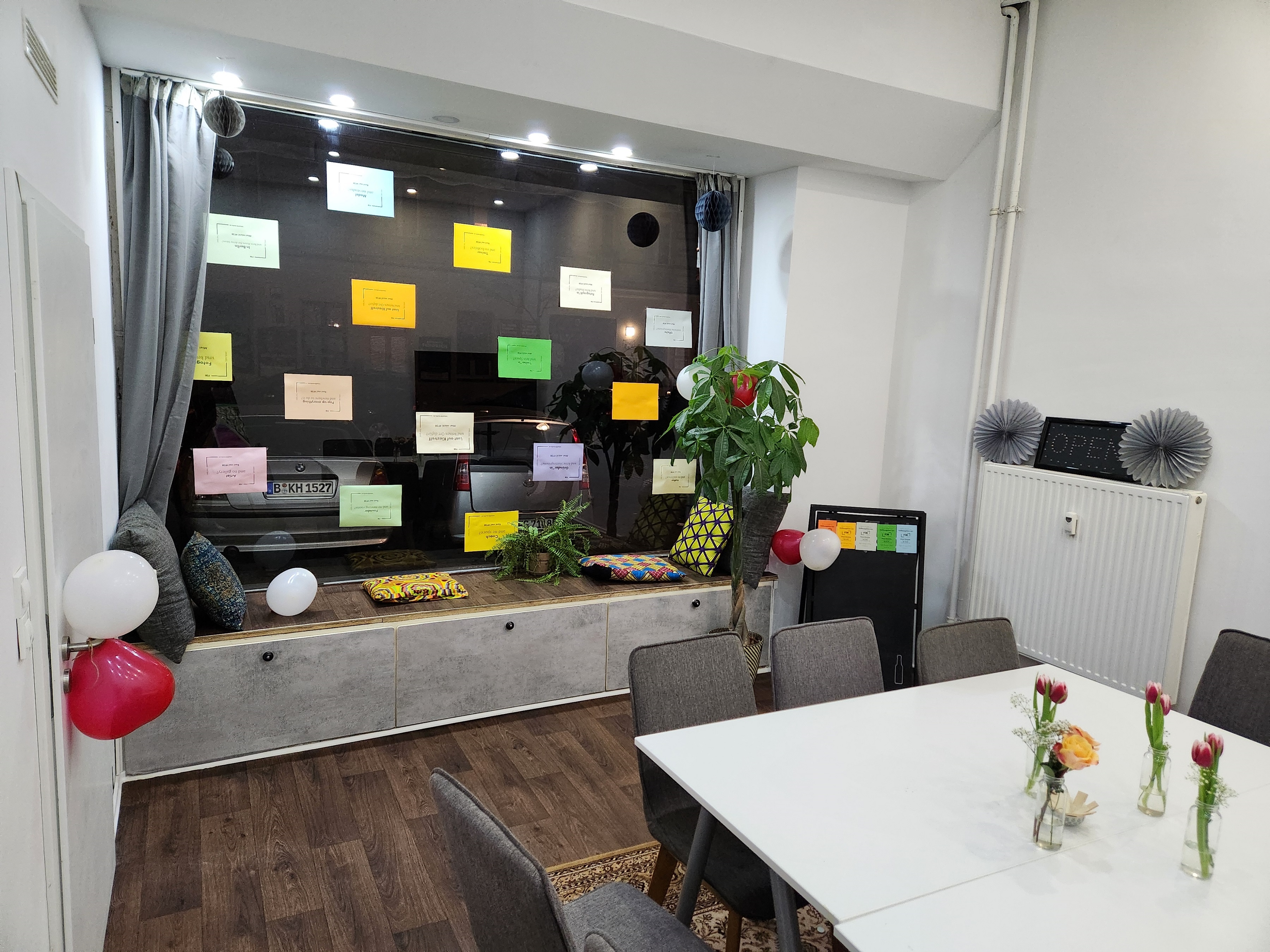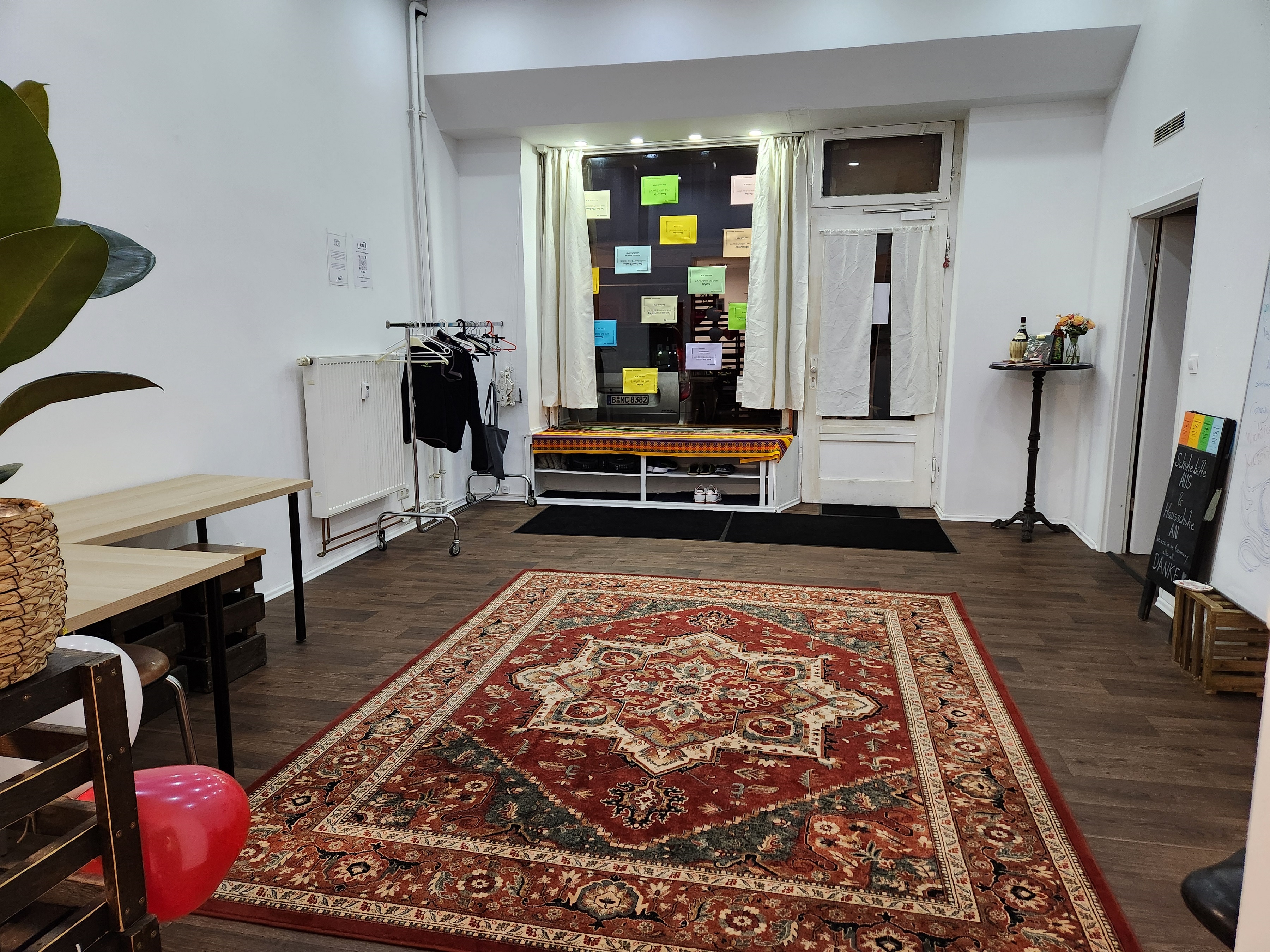 Unsere Location ist ein straßenschuhfreier Space. Bringt gerne eure eigenen Hausschuhe mit oder nutzt unsere bereitgestellten Pantoffeln.