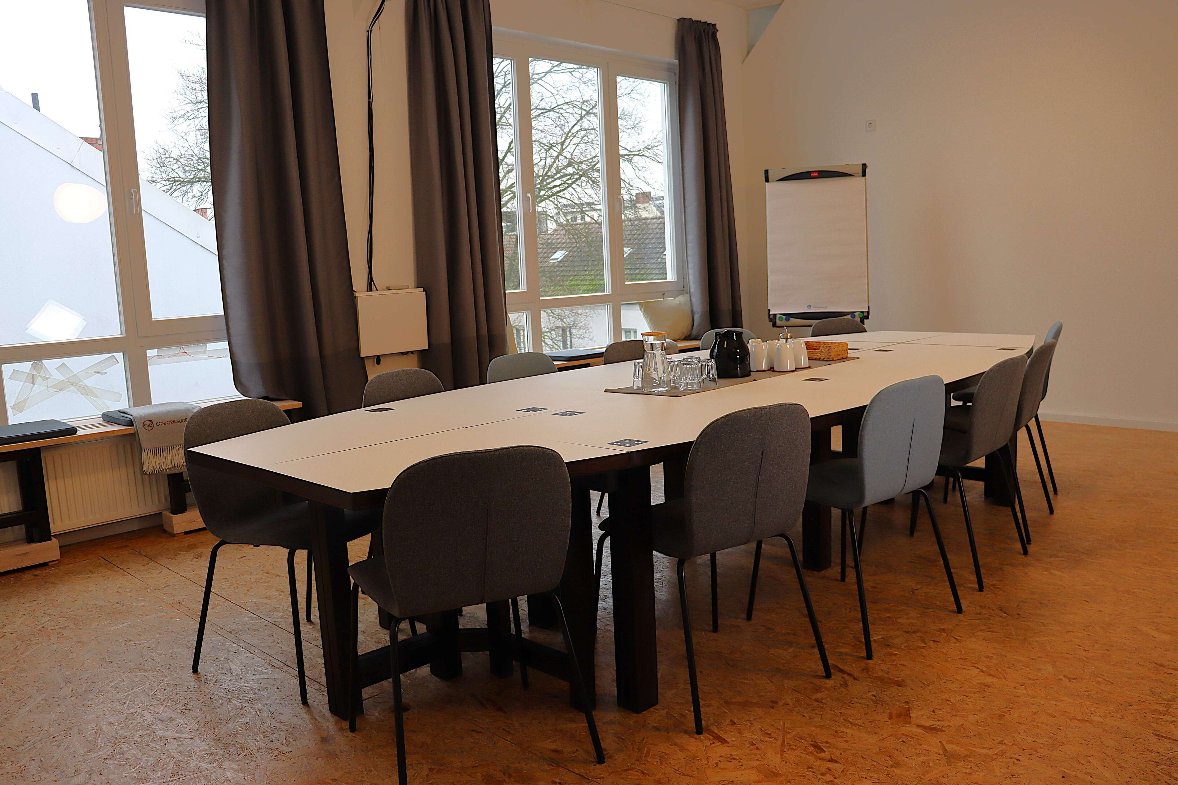 Inbegriffen sind WLAN, Flipchart/Whiteboard, Pinnwand (auch verwendbar als Kanban Board), Beamer, (Anschluss mit HDMI-Kabel) und Verdunklungsgardinen. Dazu stellen wir Kaffee, Tee und Wasser bereit. Gegen Aufpreis kannst Du einen Moderationskoffer, weitere Technik buchen und Snacks und weitere Getränke bekommen. Eine Übersicht der Bestuhlungsmöglichkeiten im Konferenzraum findest Du in unserer Galerie.